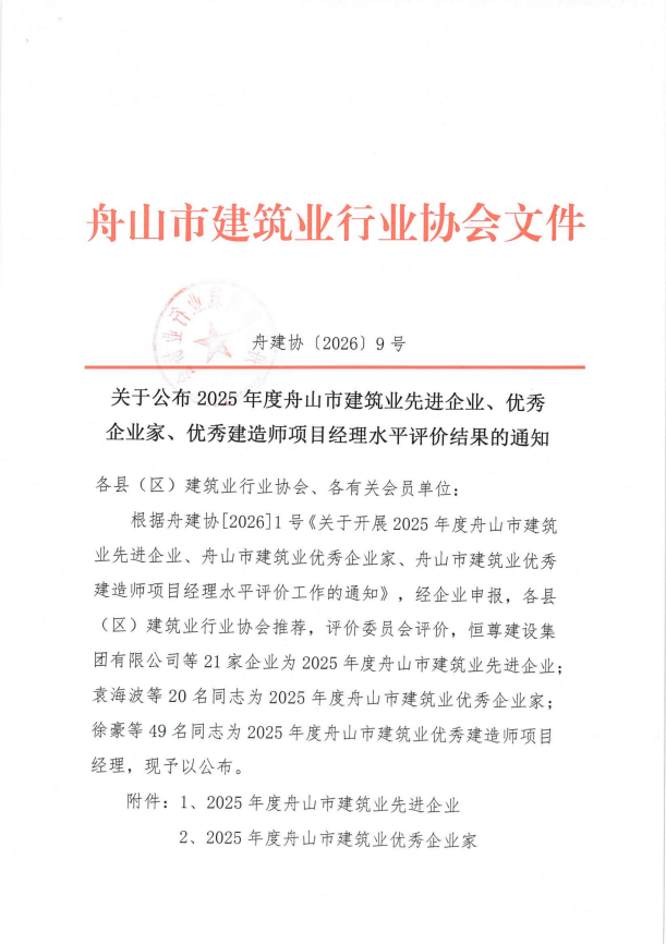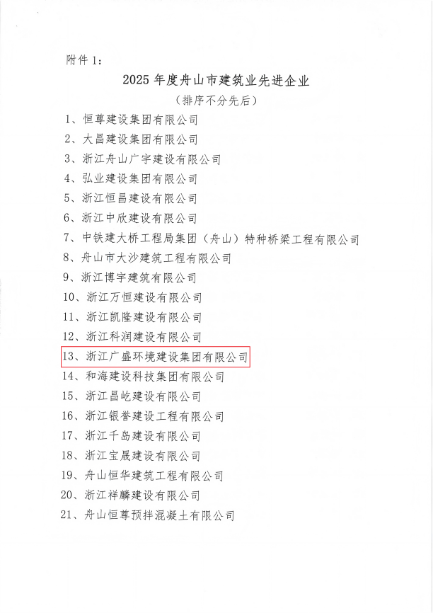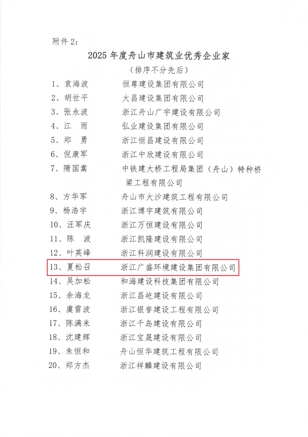 近日,舟山市建筑业行业协会下发《关于公布2025年度舟山市建筑业先进企业、优秀企业家、优秀建造师项目经理水平评价结果的通知》,广盛集团凭借稳健的经营实力、过硬的工程品质、规范的管理体系、突出的行业贡献,从众多参评建筑业中脱颖而出,成功获评“建筑业先进企业”称号,同时集团董事长夏松召获评舟山市建筑业优秀企业家,张禄获评舟山市建筑业优秀建造师项目经理。这一殊荣是行业主管部门、业界同仁对公司综合实力、工程建设水平及社会责任担当的高度认可与充分肯定。